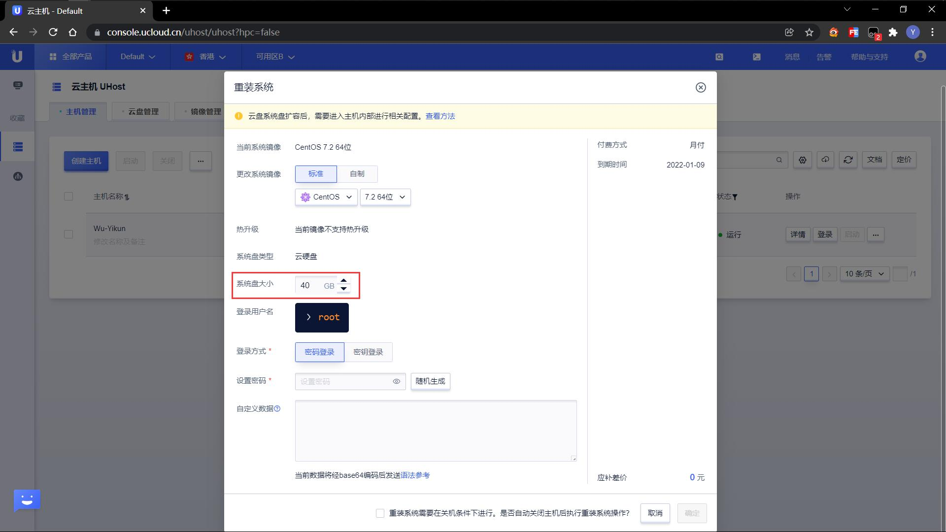 记住!系统盘大小调成 40 G,不然 UCloud 会让你补差价: