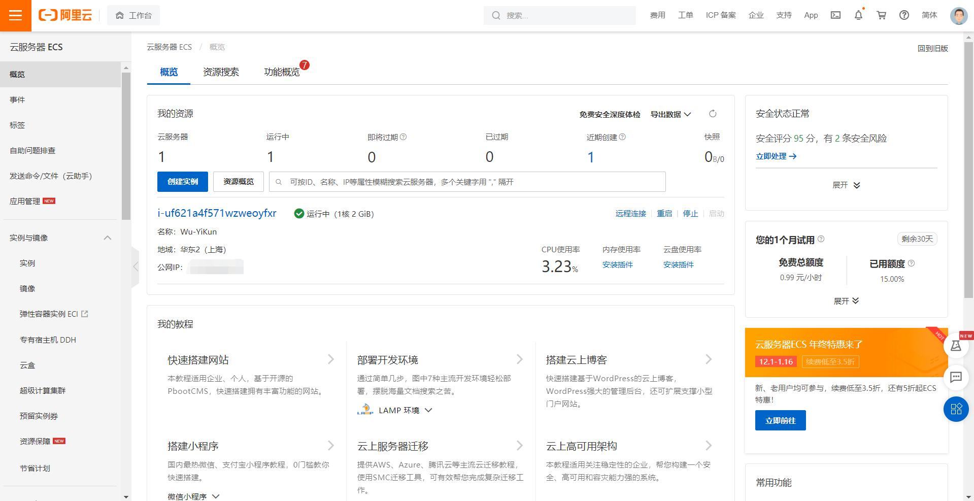 个人觉得 1核2G 配置的云服务器对于我而言完全足够了,毕竟只是搭建个人博客网站。