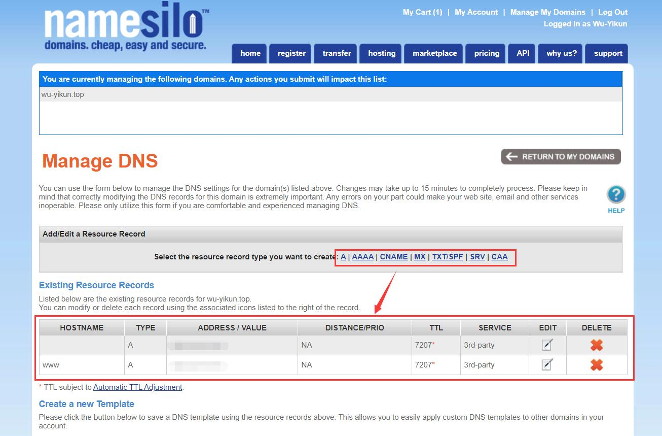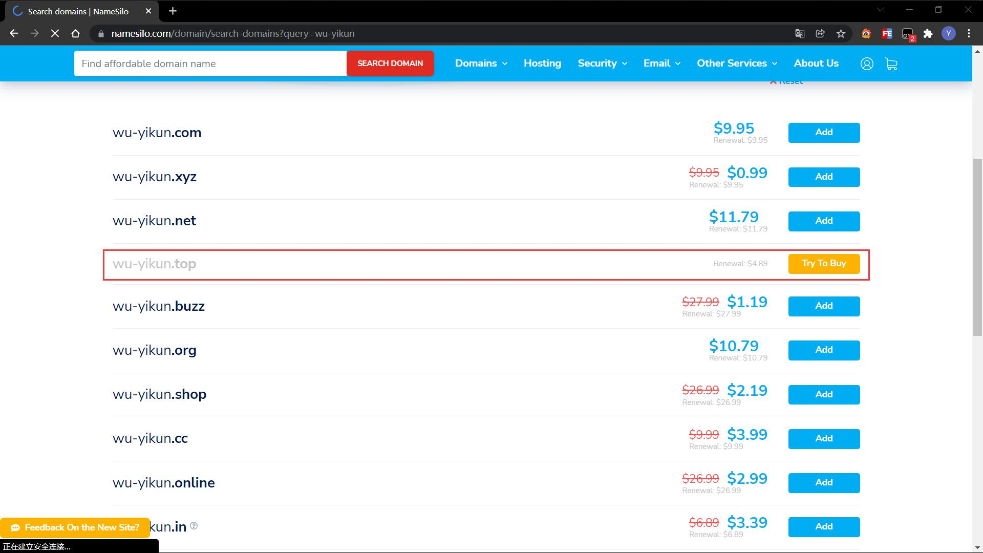 这里 wu-yikun.top 这个域名被我买走了,所以检索的时候会显示 Try To Buy,表示向这个域名持有者购买该域名!