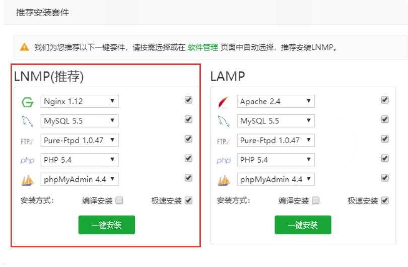 刚登陆宝塔面板时安装套件:选择 LNMP(推荐),并勾选极速安装: