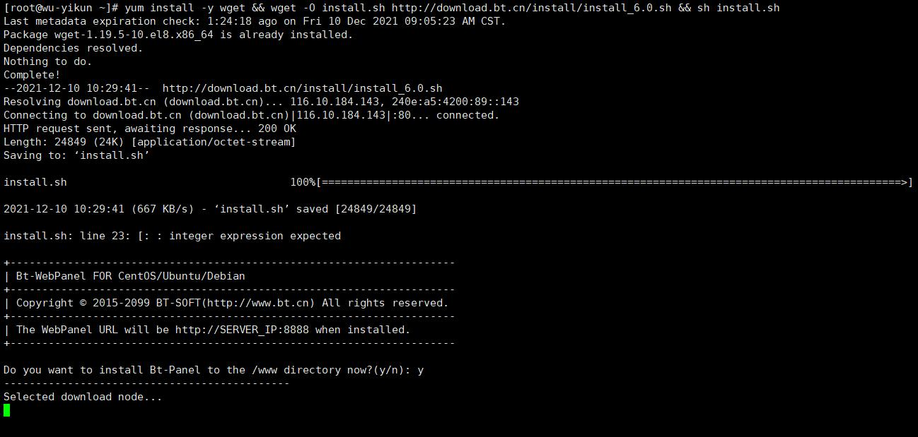 然后执行如下命令在云服务器上 (CentOS) 安装宝塔 Linux 面板: