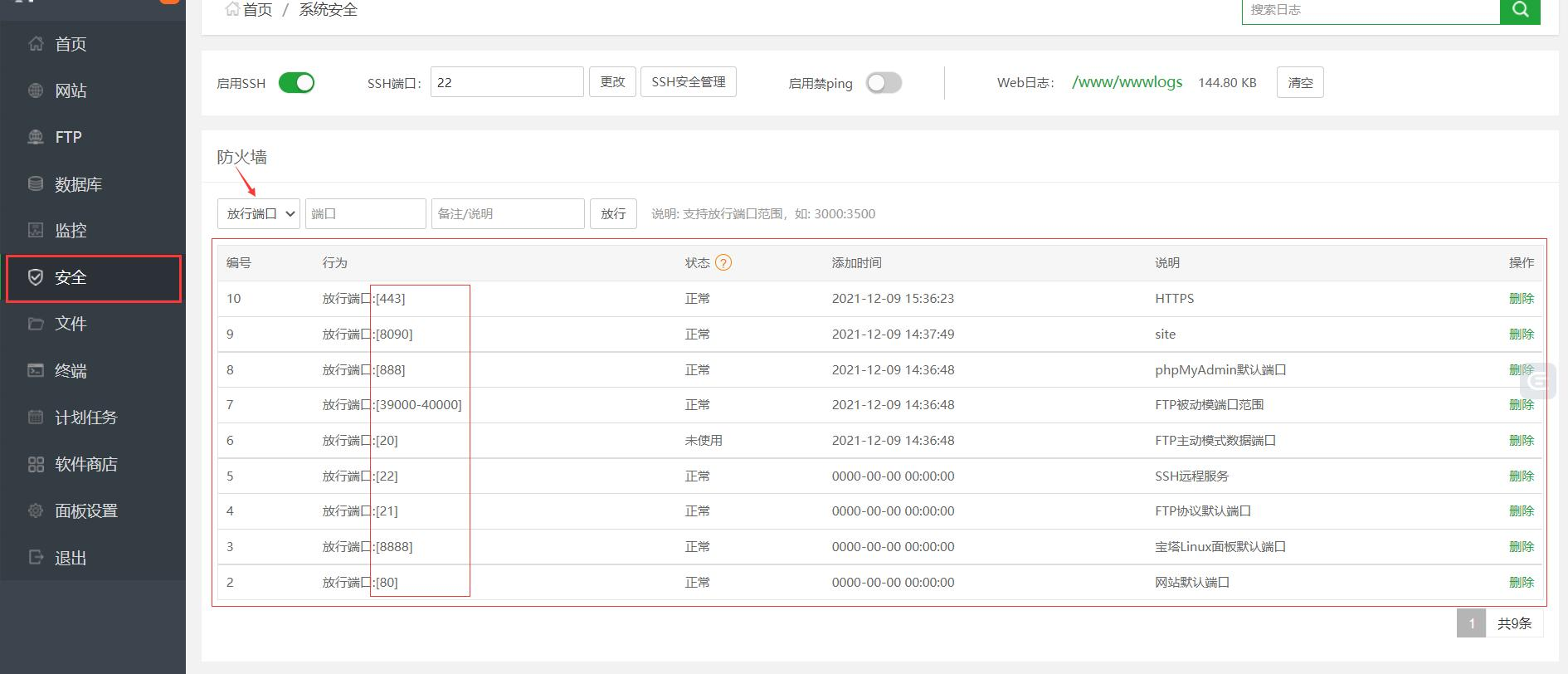 安全组放行教程,如需完整使用宝塔的所有功能,还需要放行如下端口