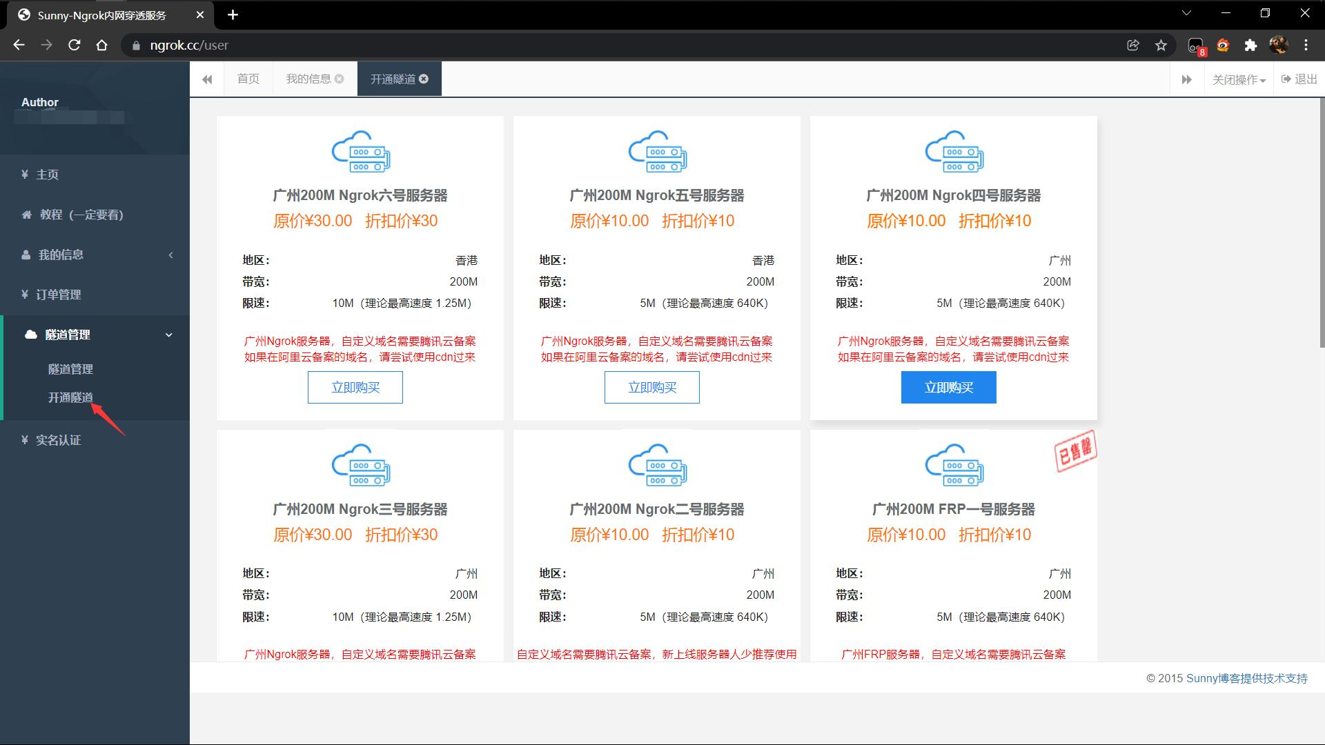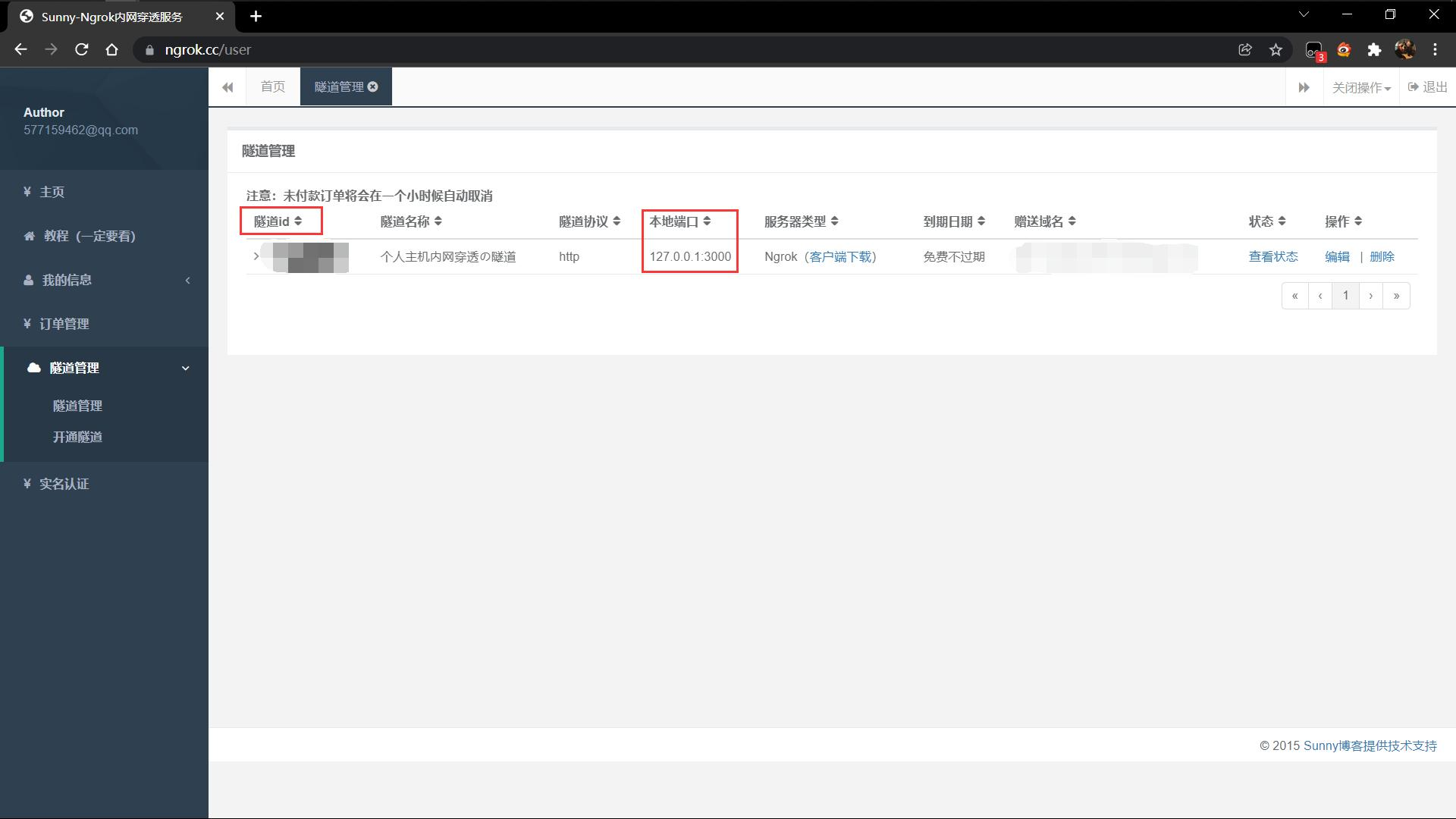 首先需要开通隧道(官方教程,不再赘述):Sunny-Ngrok 开通隧道