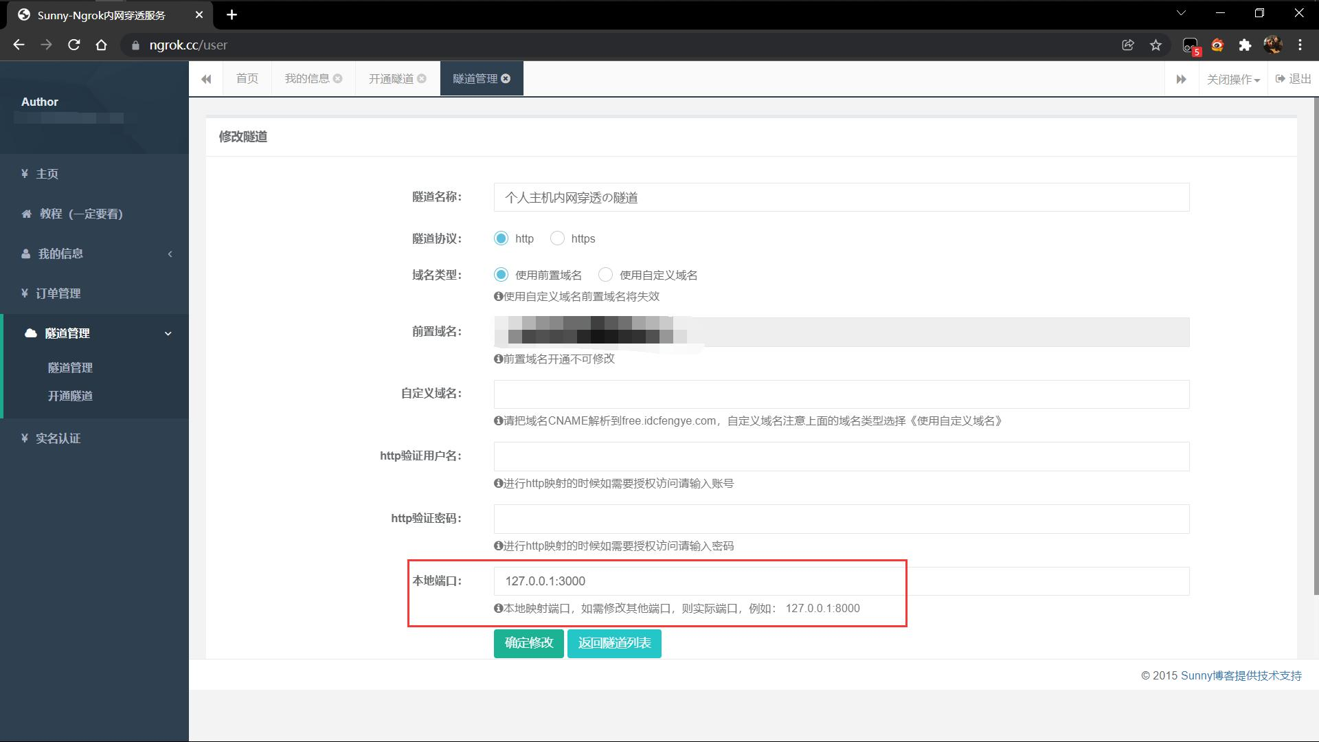 然后修改隧道要映射的本地端口号(即要让本地哪个服务穿透到公网):