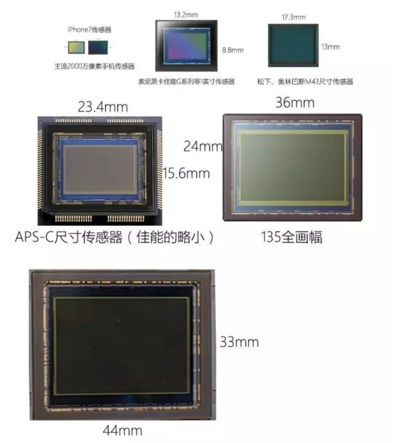相机进入数码化之后,理所当然所有的数码相机应该也是 135 全画幅相机。但是因为电子传感器曾经很贵,于是很多厂商向成本妥协,推出了小传感器尺寸的各种版本相机。