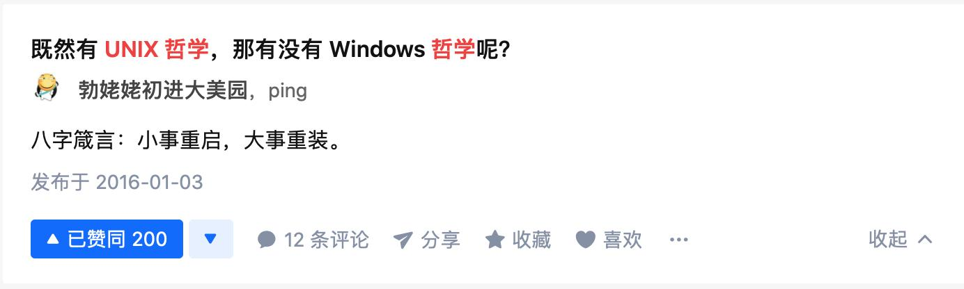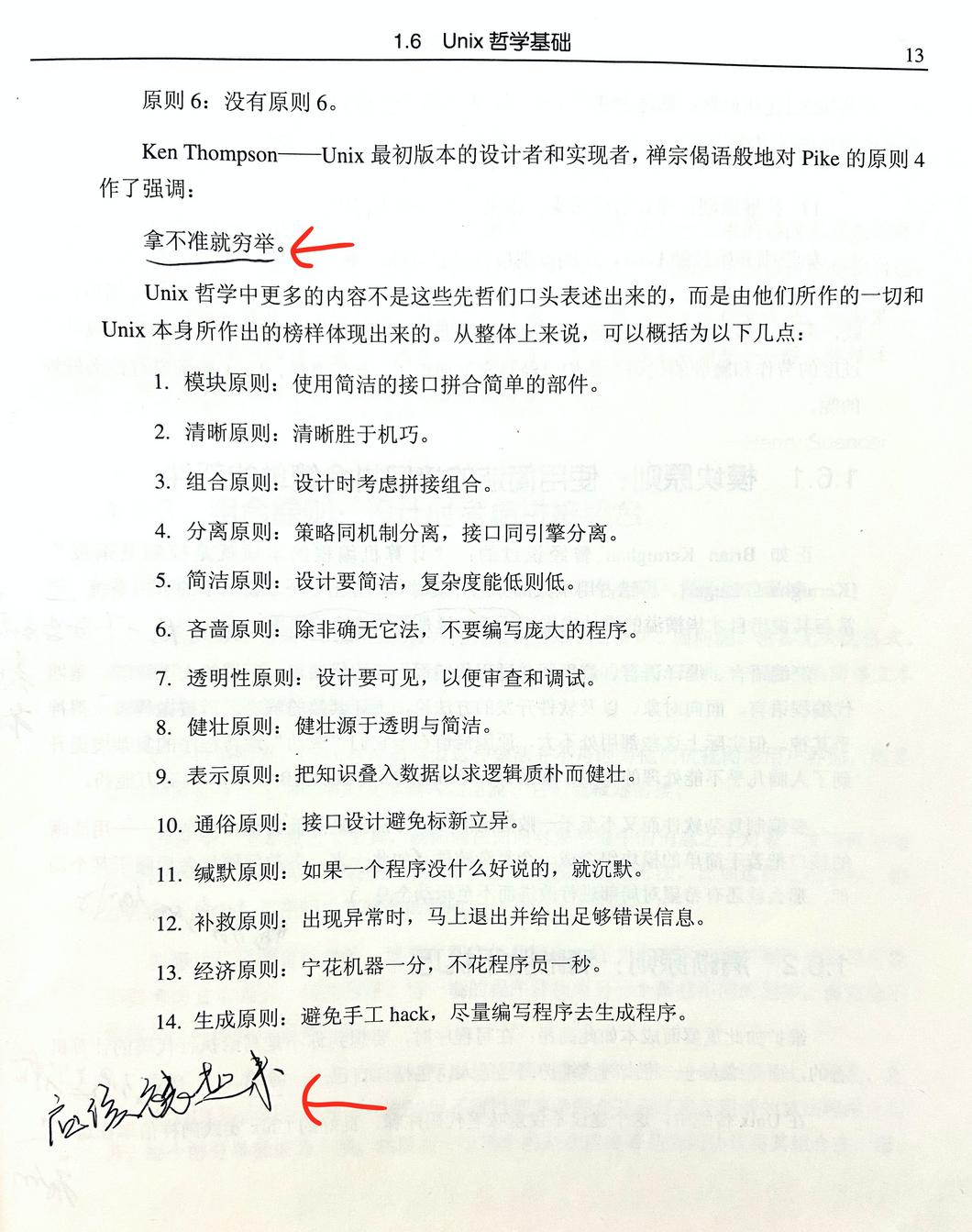 Unix 哲学用一个词概括就是 KISS (Keep It Simple, Stupid),在这个 ‘面试造火箭,上班拧螺丝钉’ 内卷年代, 很多人容易走偏,把事情复杂化,写一些花里胡哨代码,做一些花里胡哨的功能。Unix 的远古哲学告诫我们:简洁就是好,好就是简洁。 - 第二个是我自己写的,尽管大学时就看过这本书,当时只有盲目崇拜,时隔多年再看,这些原则个个是说到心尖上了,顿时感叹应该把这些 ‘哲学’ 裱起来,日看夜看。这也是本文的灵感来源。