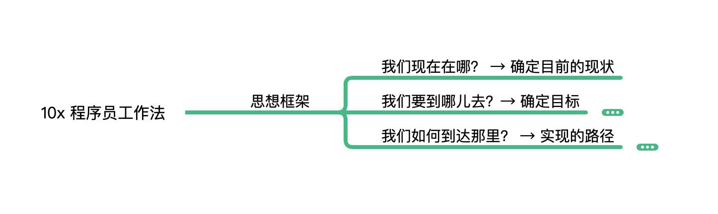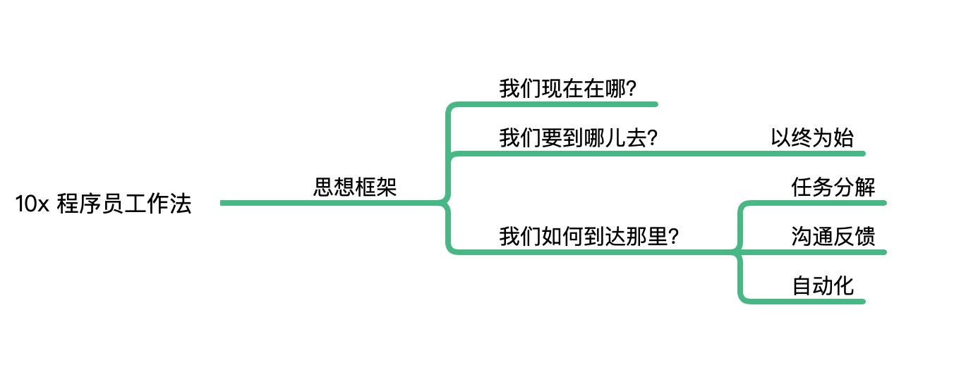 前些日子学习了 《10x程序员工作法》、《研发效率破局之道》,内容本身质量很高自不必说,给我启发较大的是他们的内容组织方式。以 《10x程序员工作法》为例,它的内容是这样组织的: