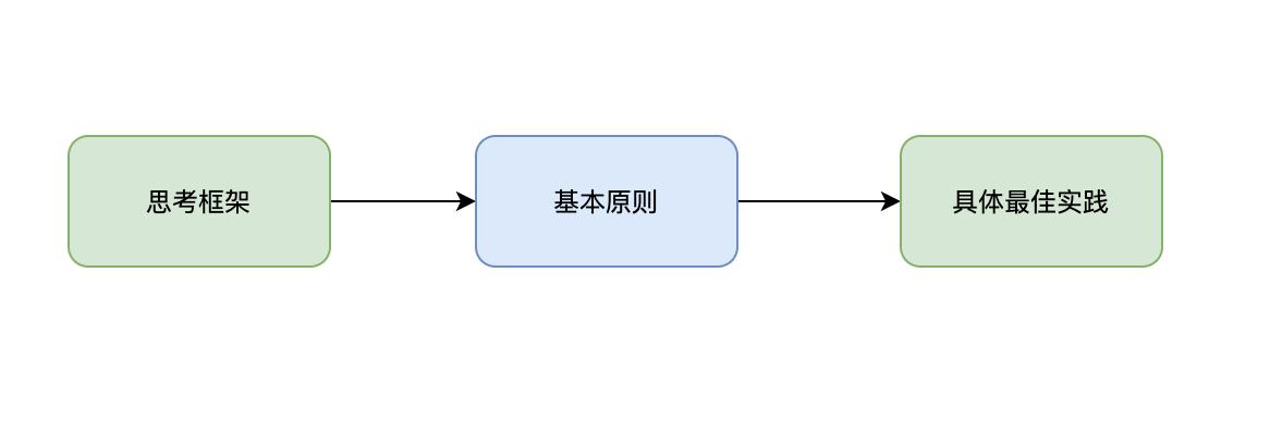 思考框架是事物的出发点,用于审视目标、把握方向;基本原则是在思考框架下的核心指导思想;最后在基本原则指导下进行具体实践。后面会详细说明这三者的关系。