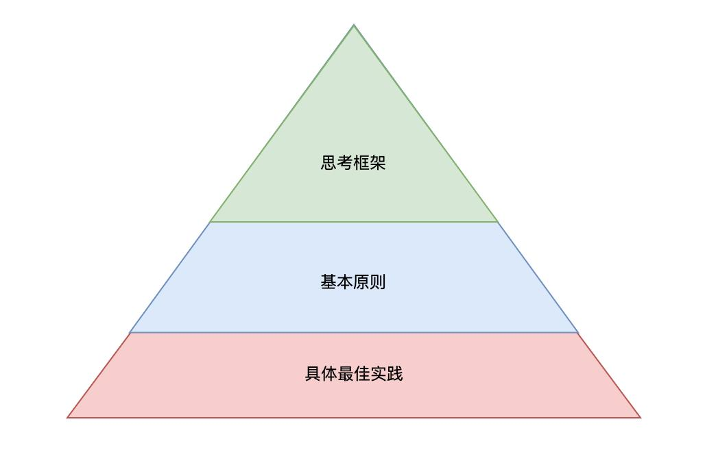 并不是说我们只要学习思考框架和指导原则就行了,最佳实践也是要刻意学习的。三个层次相得益彰,这样形成的知识体系才是比较稳固的: