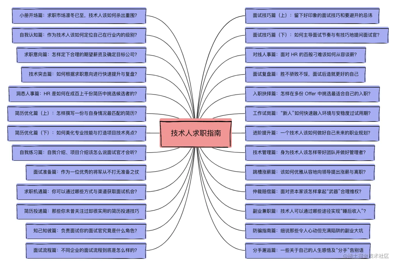 整个小册内容可分为 求职前、求职中、求职后、入职后 四个阶段,具体如下: