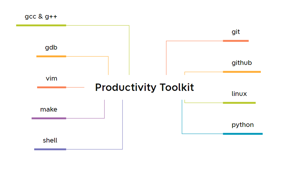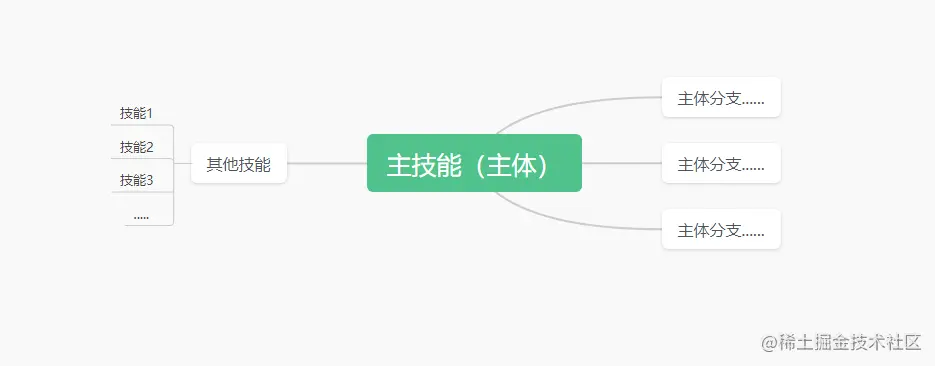第一点,整棵知识树应当围绕着一个明确的方向展开(⭐比如 C++ 方向)。因为知识树要具备高强度的专业性,不能将日常生活中懂的方方面面全部写进去,这显然并不合适。开始撰写前必须先挑选自己最擅长的方向作为主体。以开发岗为例,如果你掌握了多门语言,那么一定要先选择一门语言作为主体,其他技能可以归纳到另一个主体分支中: