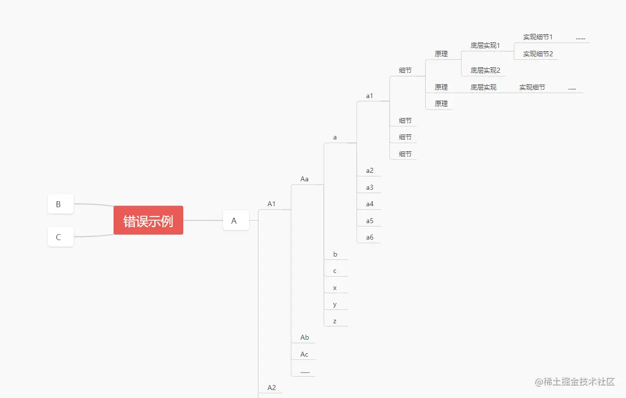 第二点,知识树不应该无限制延伸。这里主要针对树的深度和分支数量,对于某个具体的技术栈,千万别把每个细节都详细罗列,也不必无限往下深究原理,如下: