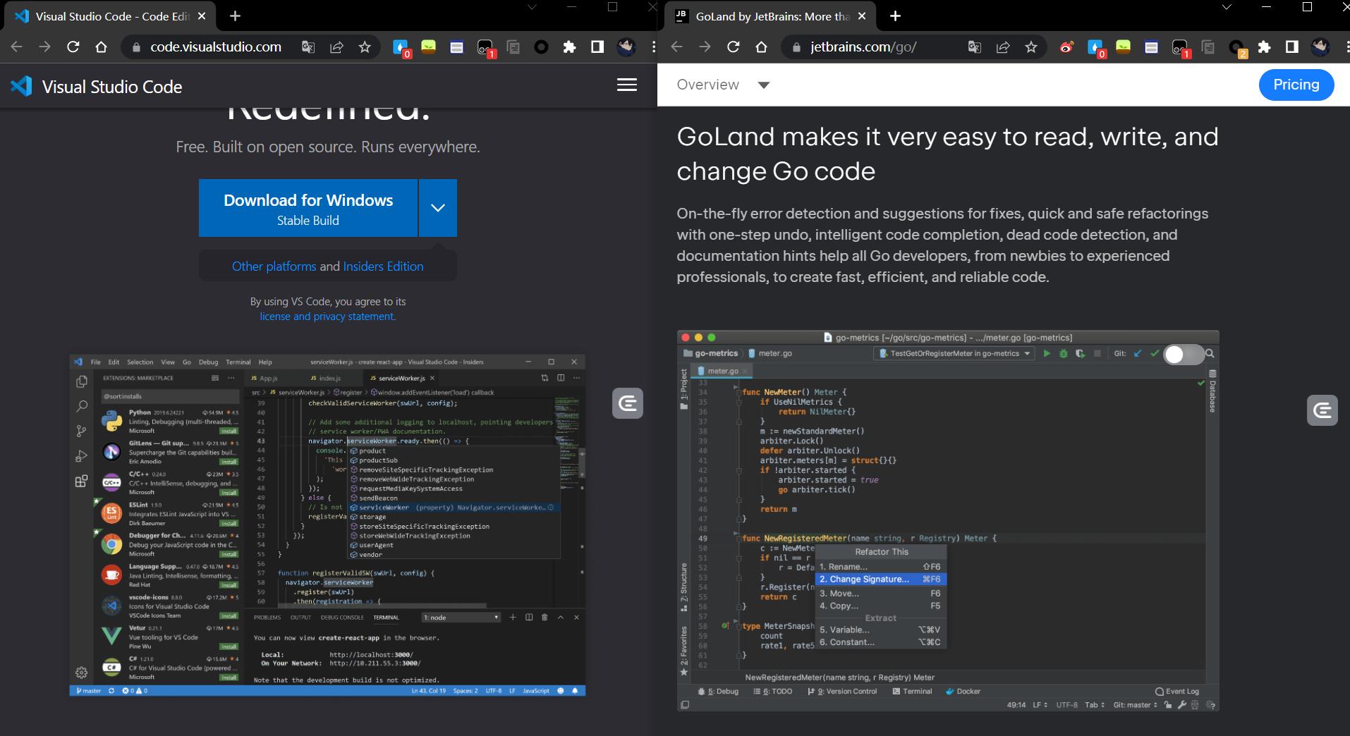 VSCode:由微软公司开发,免费。能运行在 MacOS、Windows、Linux 上的跨平台开源代码编辑器(功能齐全的 IDE),需要在扩展市场中安装 Go 插件才能支持 Golang 开发。