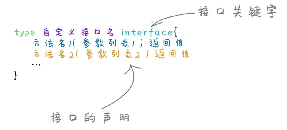 2.2.15 接口 Golang 接口内可以定义多个方法,谁将这些方法实现,就可以认为是实现了该接口(这是一种约束,不像 Java 还需要 implements 来显式实现),这样规范了方法。在调用的时候使用不同的结构体对象,可以实现执行不同的方法。这样就实现了 Go 语言中的多态。