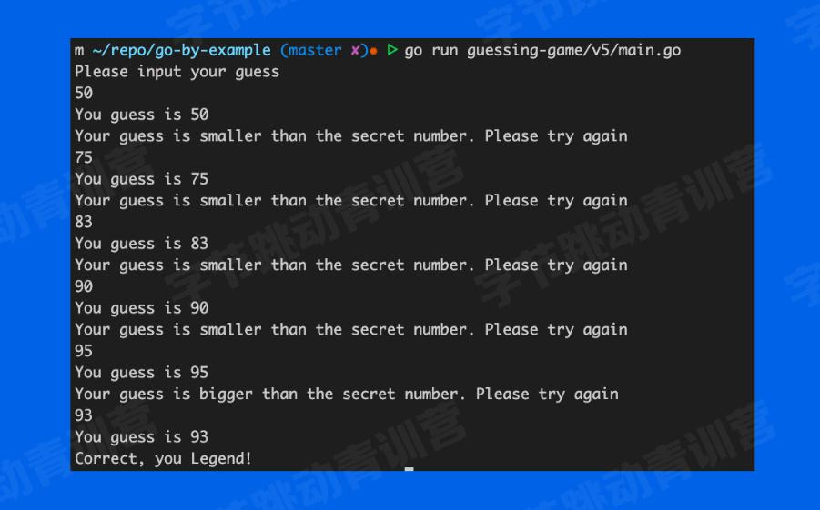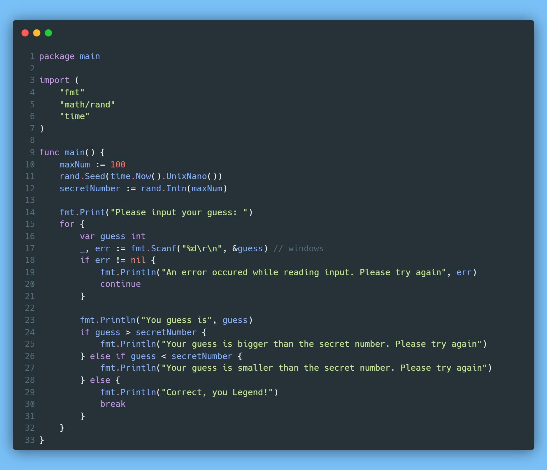 1 2 3 4 5 6 7 8 9 10 11 12 13 14 15 16 17 18 19 20 21 22 23 24 25 26 27 28 29 30 31 32 33 34 35 36 37 38 39 40 41 42 43 44 45 46 47 48 49 50 51 52 53 package  mainimport  (    "bufio"      "fmt"      "math/rand"      "os"      "strconv"      "strings"      "time"  ) func  main ()   {    maxNum := 100           rand.Seed(time.Now().UnixNano())          secretNumber := rand.Intn(maxNum)          fmt.Print("Please input your guess: " )     reader := bufio.NewReader(os.Stdin)     for  {                  input, err := reader.ReadString('\n' )          if  err != nil  {             fmt.Println("An error occured while reading input. Please try again" , err)             continue          }                                                      input = strings.TrimSuffix(input, "\r\n" )                                    guess, err := strconv.Atoi(input)         if  err != nil  {             fmt.Println("Invalid input. Please enter an integer value" )             continue          }         fmt.Println("You guess is" , guess)         if  guess > secretNumber {             fmt.Println("Your guess is bigger than the secret number. Please try again" )         } else  if  guess < secretNumber {             fmt.Println("Your guess is smaller than the secret number. Please try again" )         } else  {             fmt.Println("Correct, you Legend!" )             break          }     } }