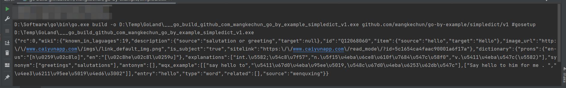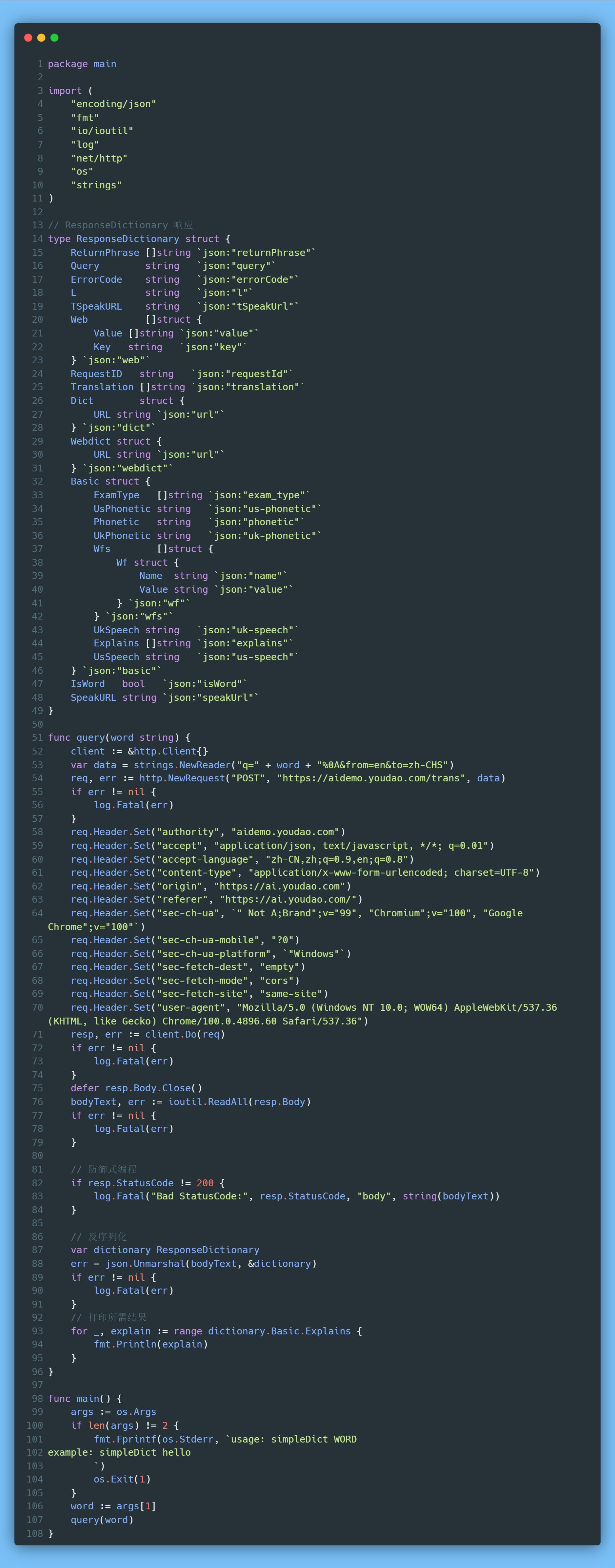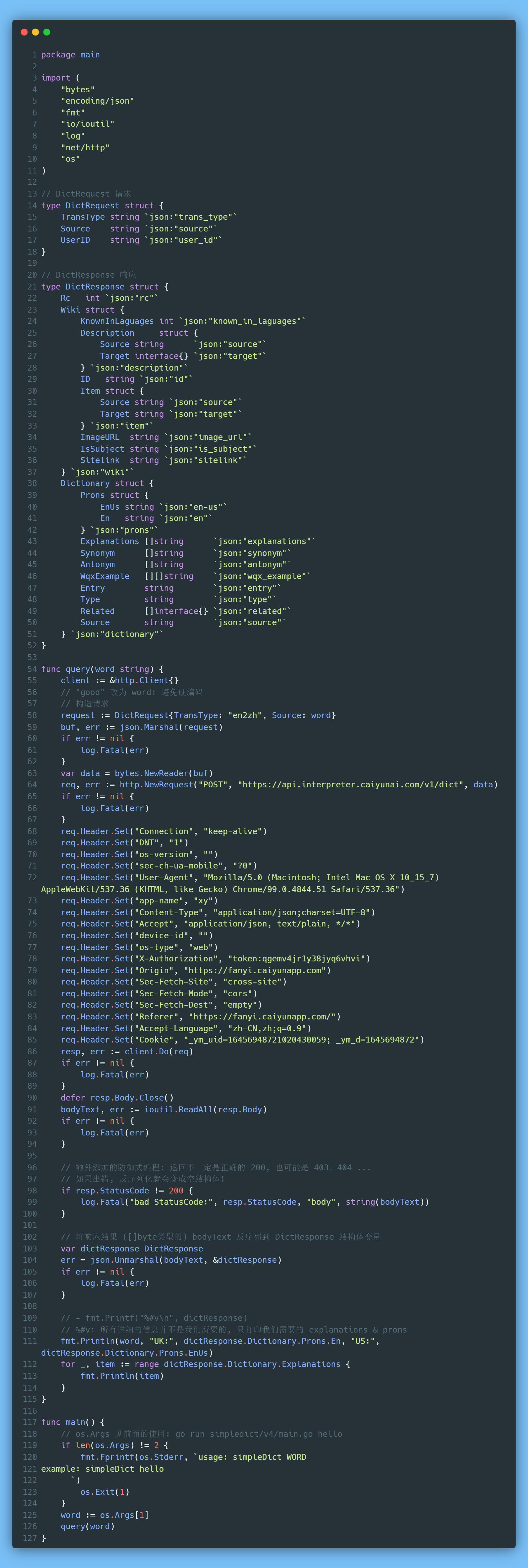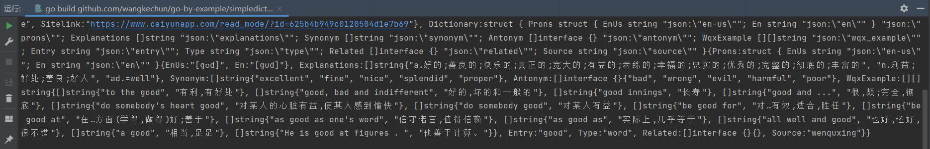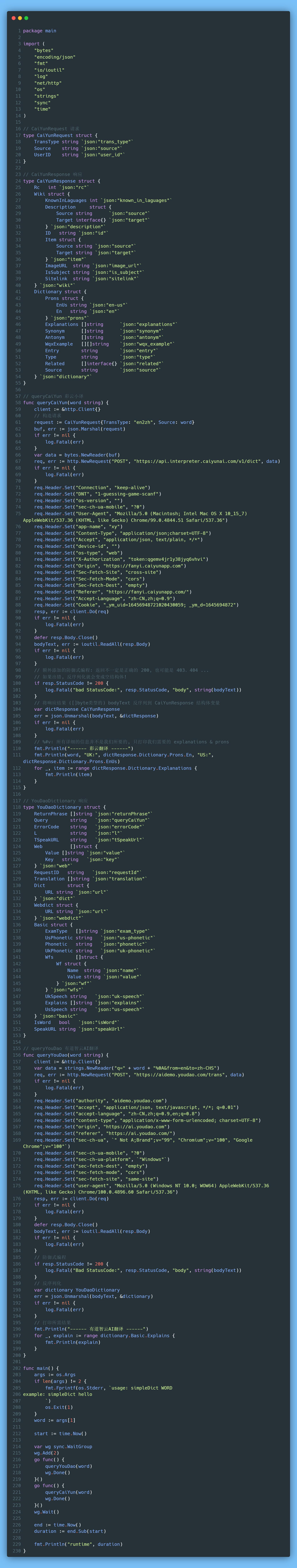 1 2 3 4 5 6 7 8 9 10 11 12 13 14 func  main ()   {         var  wg sync.WaitGroup     wg.Add(2 )     go  func ()   {         queryYouDao(word)         wg.Done()     }()     go  func ()   {         queryCaiYun(word)         wg.Done()     }()     wg.Wait() }