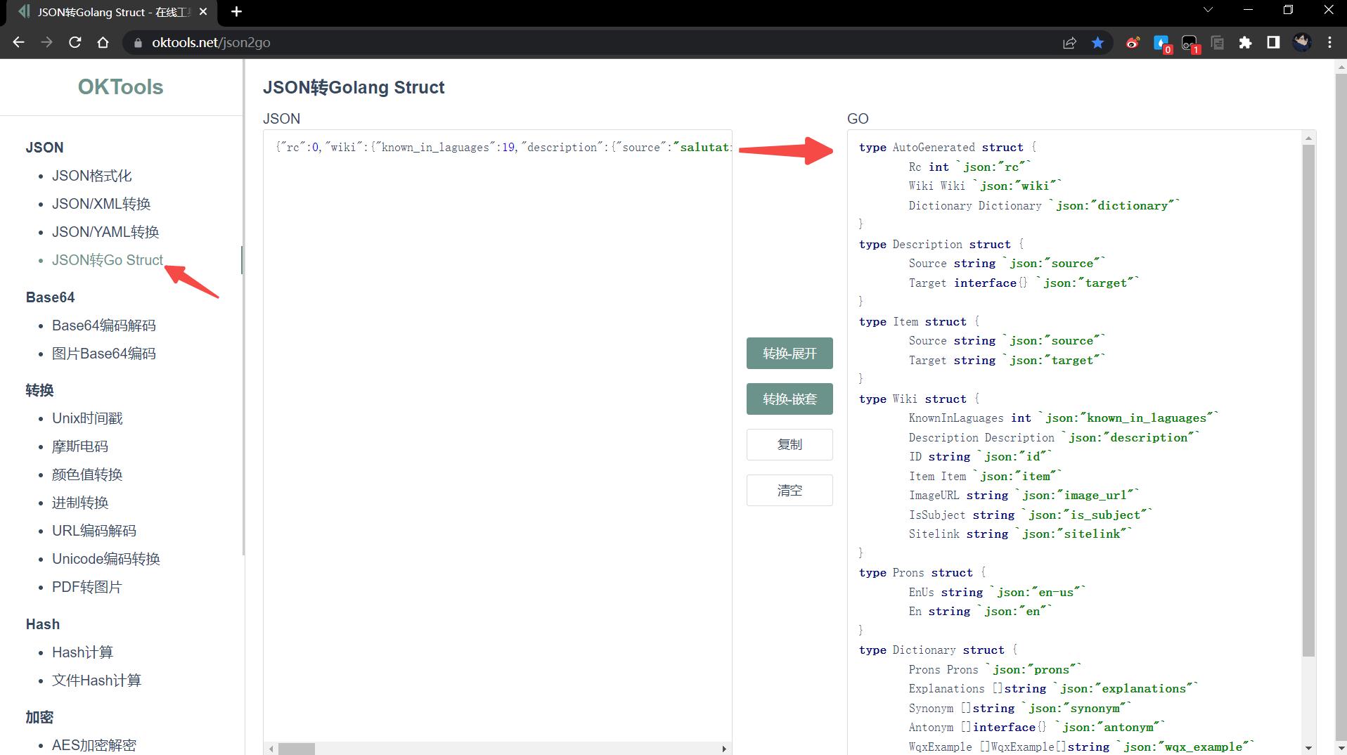然后我们需要根据 Response Body 构造出对应的结构体,然后将响应回来的 json 字符串反序列化到结构体中,显然我们不可能自己构造(繁琐且易出错),此时需要再借助第三方工具 OKTools   生成对应的结构体。