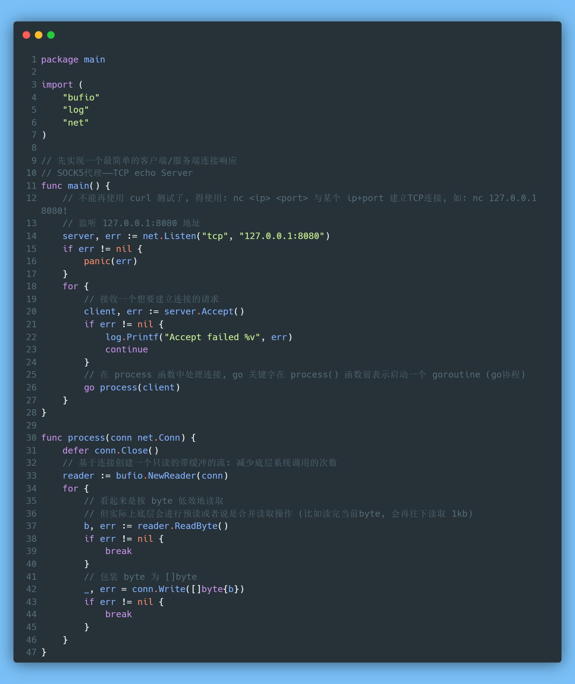 😮在正式实现 socks5 代理前,我们先用 Golang 实现一个简单的 TCP Echo Server  过渡一下:
