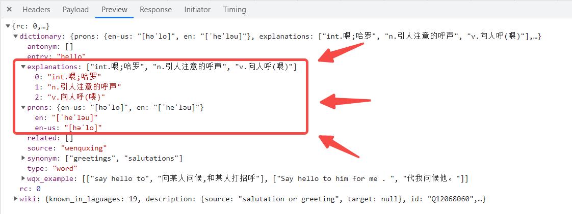 可以看出所有信息都已经打印出来,但这并不是我们想要的,我们只打印 explanations 和 prons 这两部分的信息即可。