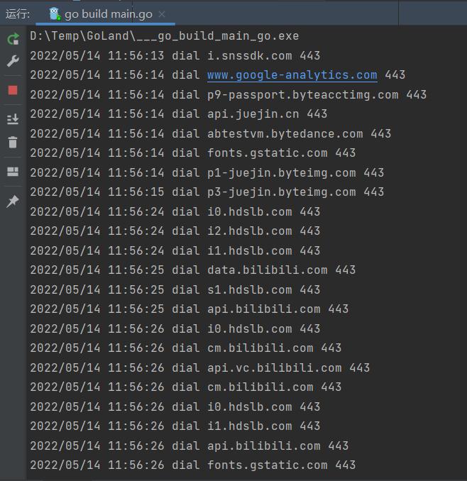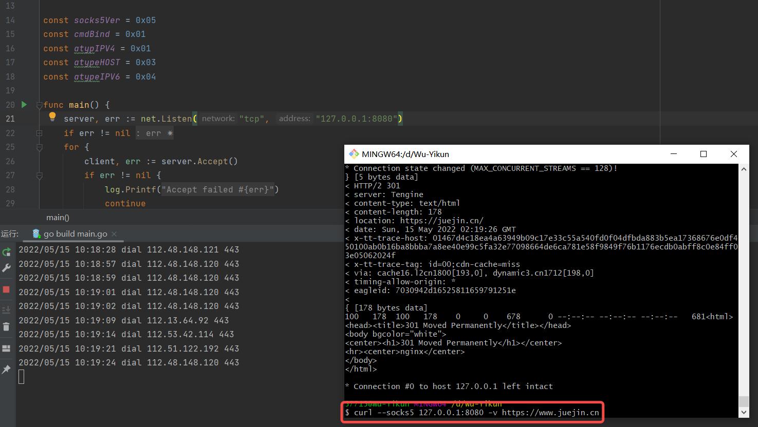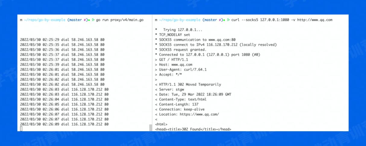 3.3 SOCKS5 代理 先浅浅演示下最终效果:启动 Golang 代理服务器程序,然后通过命令行 curl -socks5 代理服务器地址 目标URL 测试(或者通过 SwitchyOmega 插件配置,然后直接访问网站),如果代理服务器能正常工作,那么 curl 命令就会正常返回,代理服务器的日志也会打印出你所访问的网站域名或者 IP,这说明我们的网络流量是通过此代理服务器转发的。